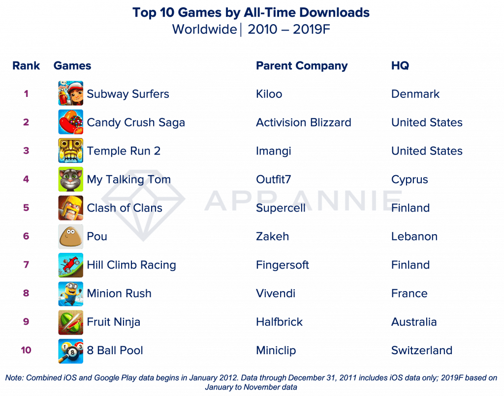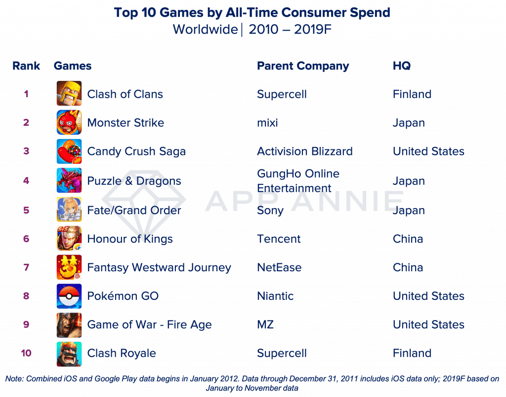 Jako nejvýdělečnější mobilní hra posledních deseti let se tak vyprofiloval titul Clash of Clans a až na třetím místě je fenomén Candy Crush. Samozřejmě se jedná o globální statistiky, takže v žebříčku najdeme i tituly ze specifického čínského nebo japonského trhu, které pořádně nepronikly k západním uživatelům. Zajímavý je i žebříček nejstahovanějších her, kde najdeme jen dva zástupce těch nejvýdělečnějších (Clash of Clans a Candy Crush).