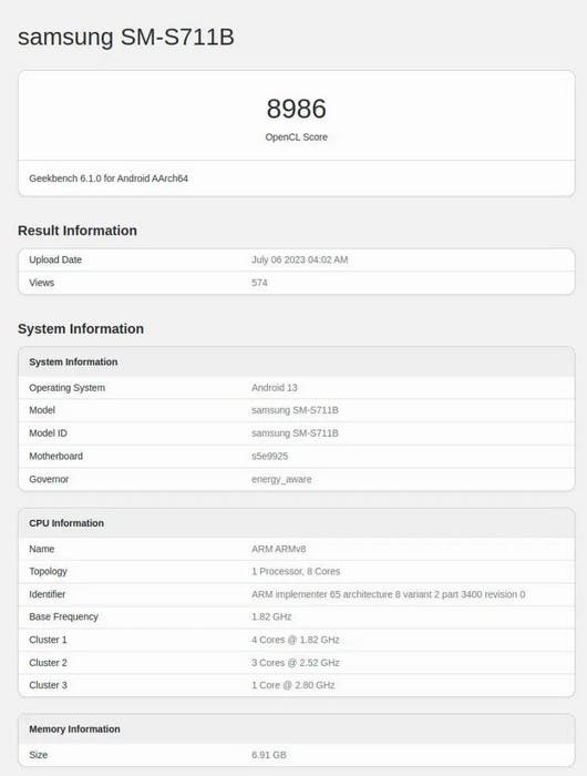 Samsung Galaxy S23 FE figuruje v testovacím výpisu pod kódovým označením SM-711B. Vidíme, že testováním prošel s osmi jádrovým procesorem s označením s5e9925 a maximálním taktem 2,80 GHz na primárním jádru. GPU pak má označení Samsung Xclipse 920. Tyto skutečnosti jasně ukazují na čipset Exynos 2200. Dále vidíme, že s čipsetem je spojeno 8 GB operační paměti a také to, že telefon běží na systému Android 13.