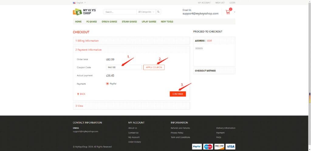 Krok 4: Dostanete se na platební rozhraní, kde vyplňte kupónový kód „FAK188“ a klikněte na „APPLY COUPON“ (POUŽÍT KUPÓNOVÝ KÓD), poté by měla být zobrazena sleva. Nakonec zaškrtněte „PayPal“ a klikněte na „CONTINUE“ (POKRAČOVAT), abyste dokončili platbu.