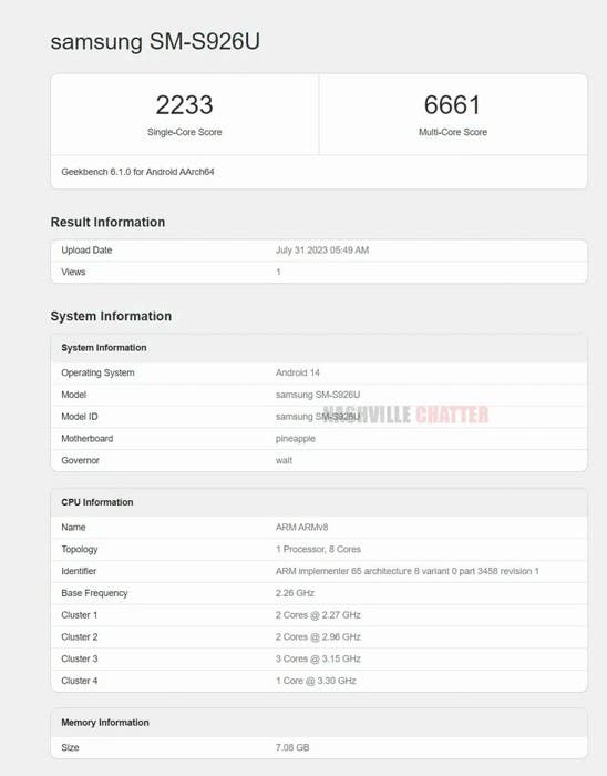 Odhady tipařů o tom, že Samsung u svých vlajkových strojů má dva různé čipsety podpořily i benchmarkové testy Geekbench. Tam se totiž objevil model Samsung Galaxy S24 Plus s kódovým označením SM-S926U. Písmeno U na konci označení zřejmě znamená americkou verzi tohoto telefonu. V testovacím výpisu vidíme, že jej pohání osmijádrový procesor Qualcomm s interním označením „pineapple“, maximálním taktem na primárním jádru 3,30 GHz a architekturou 1/3/2/2. Jde tedy o procesor Snapdragon 8 Gen3. Při testech čipset doplnilo 8 GB operační paměti a systém Android 14. V Single-core testu získal telefon Samsung Galaxy S24 Plus 2233 bodů a ve více jádrovém testu pak 6661 bodů.