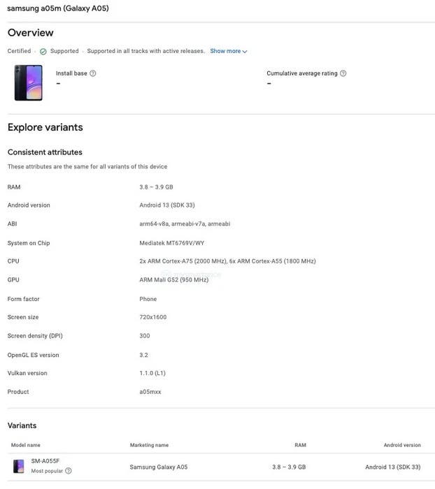 Specifikace modelu Samsung Galaxy A05 podle Google Play Console