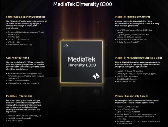 Nový čipset Dimensity 8300 je postavený na druhé generaci 4nm výrobního procesu TSMC. Má osm jader rozložených do tří clusterů s architekturou 1/3/4. Primární jádro Cortex-A715 má takt 3,35 GHz a další tři jádra Cortex-A715 jsou taktovaná na 3,0 GHz. Poslední čtyři účinná jádra Cortex-A510 běží na taktovací frekvenci 2,2 GHz. Jádra doplnila grafika Mali-G615 MC6.