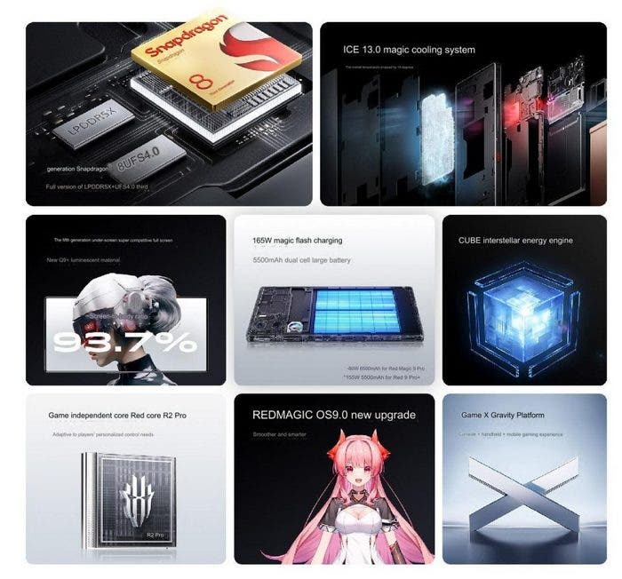 Stejně jako displeje, tak i další specifikace mají oba telefony Red Magic 9 Pro stejné. Tedy až na kapacitu baterie. Oba modely pohání procesor Snapdragon 8 Gen3, který doplnilo 8 GB/12 GB/16 GB/24 GB operační paměti LPDDR5X a 256 GB/512 GB a 1 TB interního úložiště UFS 4.0. Konektivitu zastupuje 5G NSA /SA, duální 4G VoLTE, Wi-Fi 6E 802.11 ax (2,4 GHz/5 GHz/6 GHz), Bluetooth 5.4, GPS (L1/L5), GLONASS, USB-C, NFC a 3,5 mm audio jack. Snímač otisků je integrovaný do displeje. Jsou tu i duální stereo reproduktory Magic Sound, 3 vestavěné mikrofony a herní čip Red Core R2 Pro. Samozřejmě výrobce nezapomněl ani na vylepšený chladicí systém ICE 13. Operačním systémem je Android 14 s herní nadstavbou Redmagic OS 9.0.