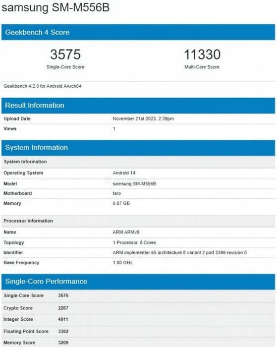 Čipset při benchmarkových testech doplnilo 8 GB operační paměti a systém Android 14. Je pravděpodobné, že k operačnímu systému výrobce přidá nadstavbu One UI ve verzi 6.0. A jaké jsou výsledky testů a tedy i výkonu telefonu Samsung Galaxy M55? Tady je důležité upozornit, že testování proběhlo ve staré verzi Geekbench 4.2. Skóre je tím pádem poněkud vyšší ve srovnání s testováním ve verzi Geeekbench 5.0 nebo Geekbench 6.0. V Single-core testu telefon nasbíral celkem 3575 bodů a ve více jádrovém testu pak 11330 bodů. Sami tedy vidíte, že srovnání výkonu s telefony střední třídy testovanými ve vyšších verzích Geekbench je nerelevantní.