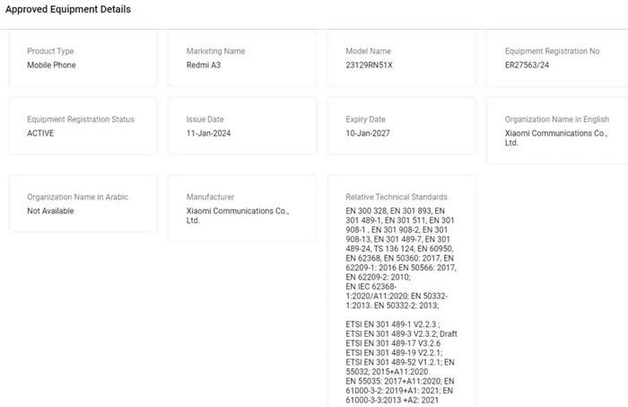 Uvedení modelu Redmi A3 je podle tipařů na dohled, a to možná ještě v tomto nebo příštím měsíci. Kromě certifikace TDRA má totiž také thajskou certifikaci NBTC. První certifikací telefon prošel s kódovým označením 23129RN51X a druhá certifikace potvrdila jeho obchodní název Redmi A3.