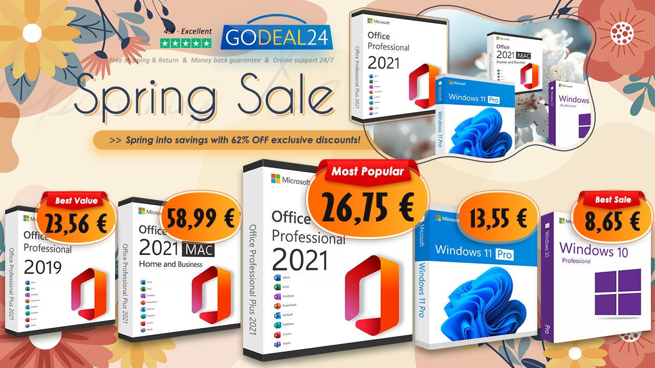 To ale není vše. Pokud stále používáte starší verzi systému Windows, proč nepřejít na nejnovější Windows 11? Windows 11 přináší dosud nevídané zážitky, protože na hlavní panel přidává novou funkci vyhledávání Bing s umělou inteligencí. Windows 11 Pro je nyní k dispozici na Godeal24 za pouhých 13,55 €! Pokud konfigurace vašeho počítače nesplňuje požadavky pro upgrade na Windows 11, můžete si na Godeal24 stále zakoupit originální a spolehlivou licenci Windows 10 Pro za pouhých 8,65 €. Mrkněte na Godeal24 Spring Sale ještě dnes a získejte další verze Office a Windows za bezkonkurenční ceny!