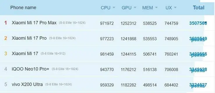 Připomeňme, že Vivo X200 Ultra běží na loňském Snapdragonu 8 Elite a dosahuje skóre 959 329. Vidíme pozoruhodné, že Xiaomi 17 Pro a 17 Pro Max zaostávají dokonce i za standardním modelem. Výsledky naznačují spíše mírný pokrok než velký skok vpřed. Vzhledem k tomuto neúspěchu může být příčinou zpoždění čipu ladění nebo optimalizace softwaru. Není to poprvé, co se to stalo. Mobilní telefony Xiaomi často dosahují nižších výsledků, než se očekávalo, ve srovnání s konkurencí používající stejný hardware.